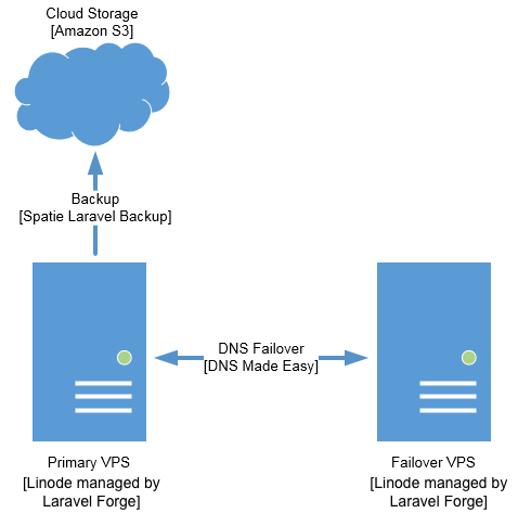 For the failover VPS, the $5 / month plans should be sufficient for a secondary instance that will hopefully never be used. This approach assumes that your failover simply displays a message that your site is currently unavailable (the “fail whale” approach).